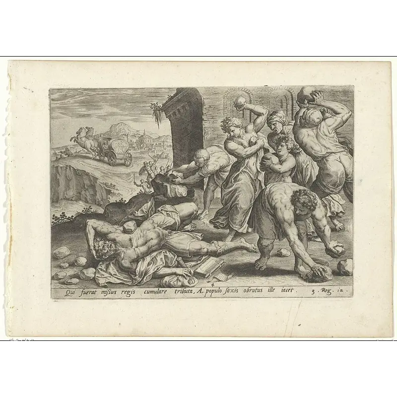 Woodcut depicting the stoning of Adoniram, by Johann Christoph Weigel, 1695.