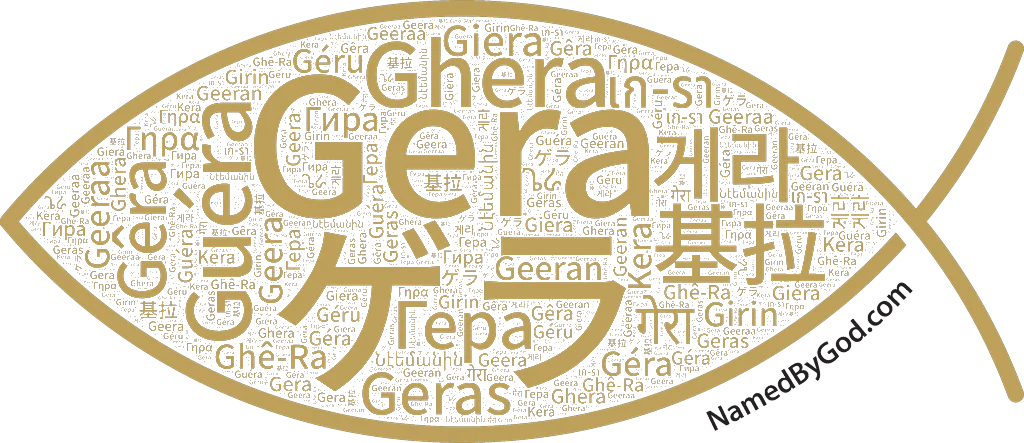 The name Gera, derived from Hebrew origins, carries the meanings of "a grain" and "pilgrimage." Linguistically, the name reflects agricultural and spiritual undertones, suggesting both provision and a journey with divine purpose. In ancient Israelite culture, names often carried profound significance, encapsulating aspects of identity, heritage, or spiritual calling. The dual meaning of Gera aligns with themes of sustenance and movement, which are prevalent in biblical narratives.