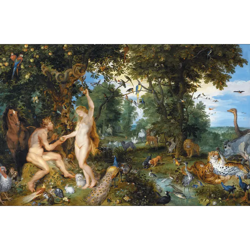 The Garden of Eden with the Fall of Man by Jan Brueghel the Elder and Pieter Paul Rubens, c. 1615, depicting Eve reaching for the forbidden fruit beside the Devil portrayed as a serpent