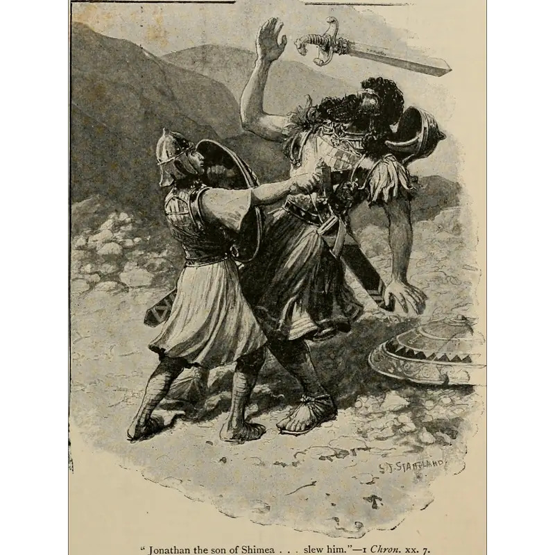 Shimea appears in multiple contexts within scripture, showcasing its versatility and prominence. As the brother of David, Shimea is mentioned in passages such as 1 Samuel 16:9 and 1 Chronicles 2:13, where his role in the family dynamics of Jesse's household is highlighted. He is also identified as the father of Jonadab and Jonathan, figures who play important roles in the narrative of 2 Samuel. Another Shimea, the son of David and Bathsheba, is listed among David's children in 1 Chronicles 3:5 and 14:4, signifying the continuation of David's royal lineage. Additionally, the name is associated with two Levites from the families of Merari and Gershom, as well as a Benjamite descendant of Jeiel, illustrating its widespread use across various tribes and roles within Israel.